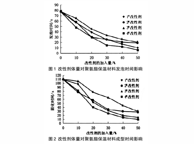 改性劑加入的體量不同對整個制備過程影響也不同。由于改性劑活性不同,聚氨酯材料發(fā)泡及成型時間也會發(fā)生相應變化。改性劑體量對聚氨酯保溫材料發(fā)泡及成型時間的影響如圖1、圖2所示。