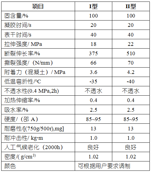 4、防水性能優良--涂層致密連續、無接縫、高彈性,能在風吹雨淋日曬的情況下保持良好防水性能。